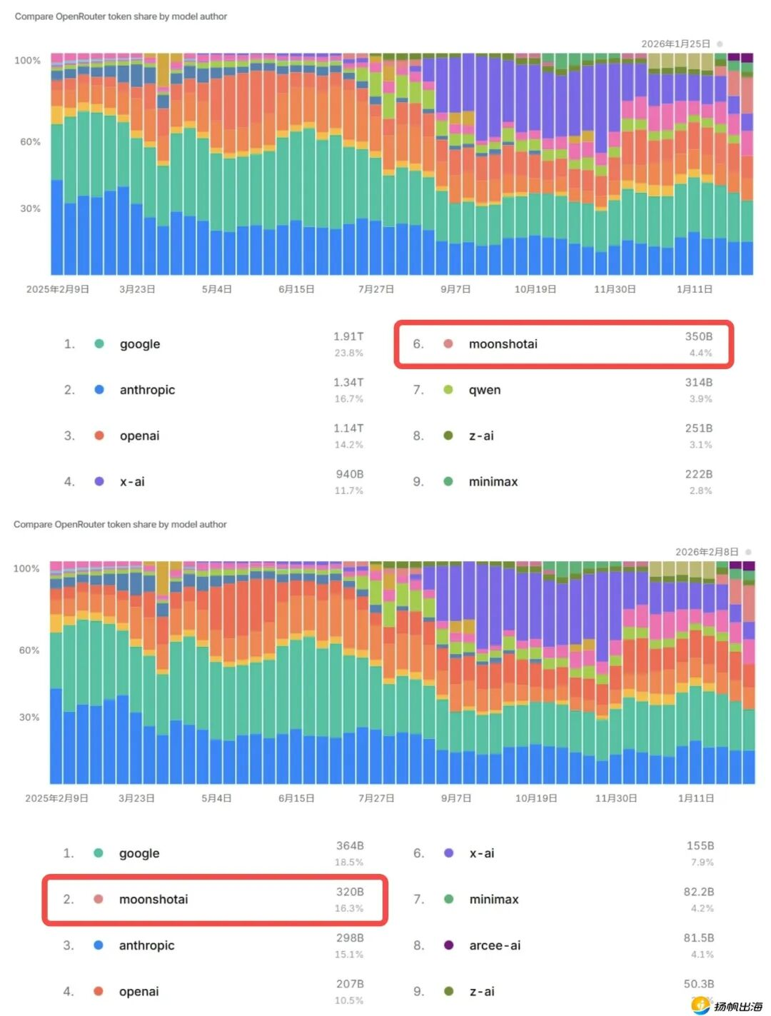 模型市场份额,图(上)为1月25日,图(下)为2月8日。图源:OpenRouter