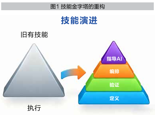技能需求的根本性重构正在发生。传统以“会做”为核心的单一技能金字塔,正在向以“会定义、会验证、会编排、会指导AI”为核心的多层次能力体系转变(见图1)。新的能力体系能够避免因应用AI导致的“能力退化”。过去关于自动化偏误及自动化导致技能衰退的研究已有不少,医疗、航空等高风险行业是这方面研究的前沿与焦点,因为在这些行业中,失误带来的后果尤为严重。近期有学者专门讨论了生成式AI可能带来的“去技能化/再技能化”张力。这提醒我们把例外处置、边界判断与因果解释保留在人类闭环中,并通过制度化演练与回归测试对抗退化。