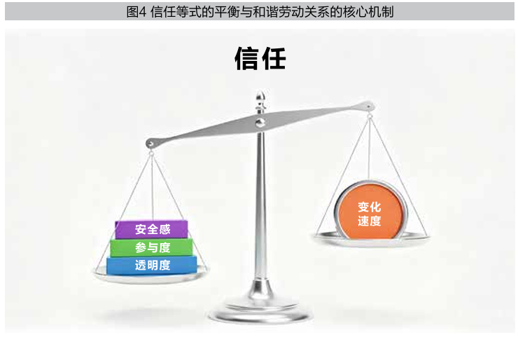和谐劳动关系的构建需要在多个维度上保持平衡。管理等式揭示了透明度、参与度、安全感与变化速度之间的动态关系,这是AI转型成功的关键平衡点(见图4)。