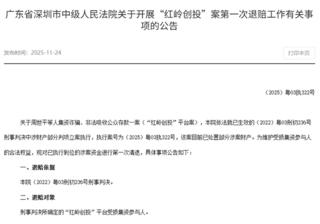 “退钱了!”2026年2月,社交平台出现不少关于红岭创投退赔款到账的帖子。伴随2025年11月深圳市中级人民法院正式启动“红岭创投非吸案”的首次清退,等待四年有余,投资受害人终于开始陆续收到退款。