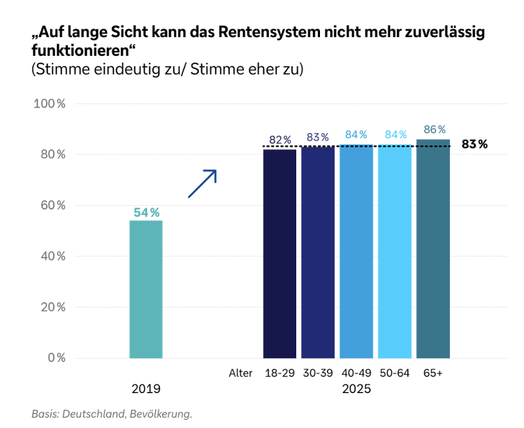 对老龄化社会和养老金的担忧,不只是在中国存在,在高税收、高福利的德国,对养老体系的怀疑也逐年攀升。德意志银行不久前发布的“2025养老保障报告:德国人如何看待养老金”(Altersversorge-Report 2025:So blicken die Deutschen auf die Rente),戳中了普遍的社会焦虑,可以作为未来养老的社会样本和参照。