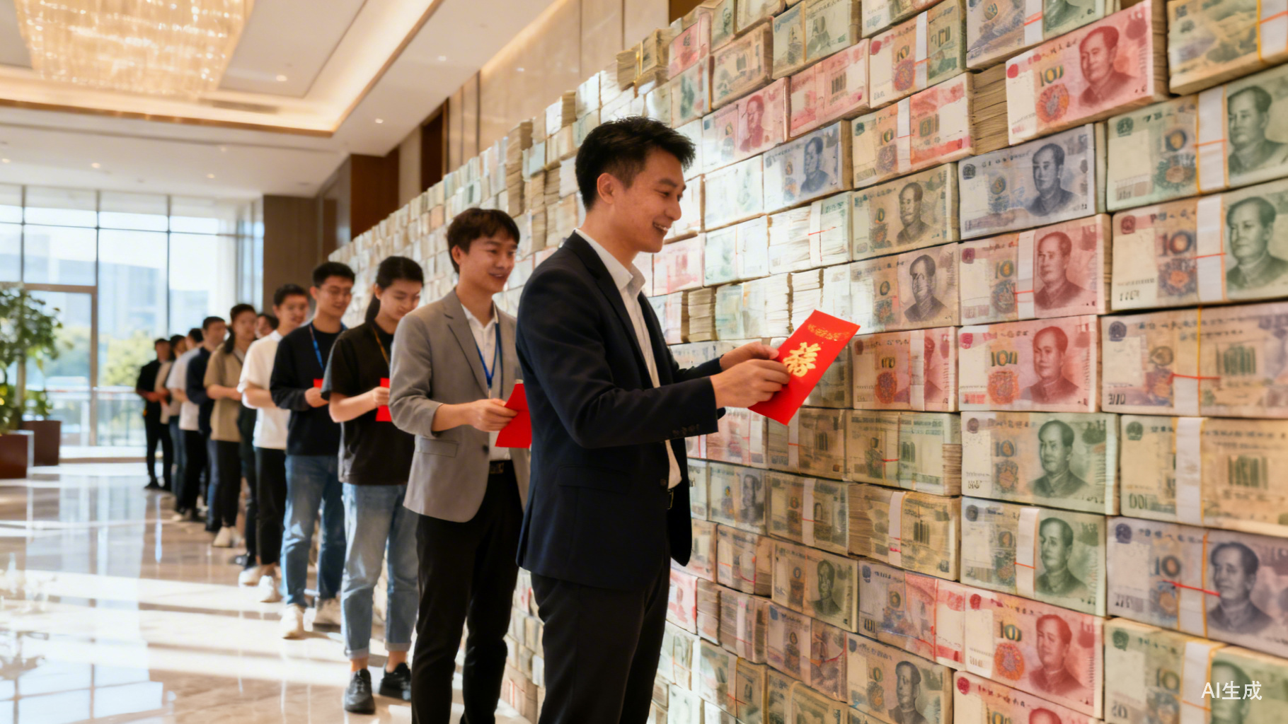 数米高的“现金墙”,由成捆百元大钞层层垒就,员工列队依次领取。