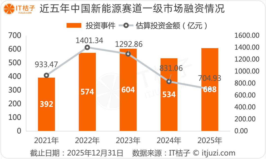 这一年,超过608起融资事件、约705亿元的资金注入,见证了新能源赛道在资本版图中的分量;但相比2022年的峰值,投资金额近乎腰斩的数据,又折射出行业从狂热回归理性的深层变革。