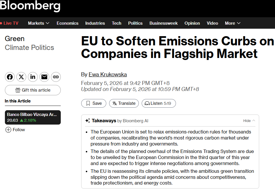 据彭博社报道,在本周欧盟领导人峰会召开、旨在加强欧盟经济之际,关于改革排放交易体系的谈判正在升温。据了解此事的欧盟政策制定者和外交官透露,在为推动绿色环保而收紧市场不到三年后,各国政府准备放缓减排步伐,并考虑采取措施减轻行业成本。