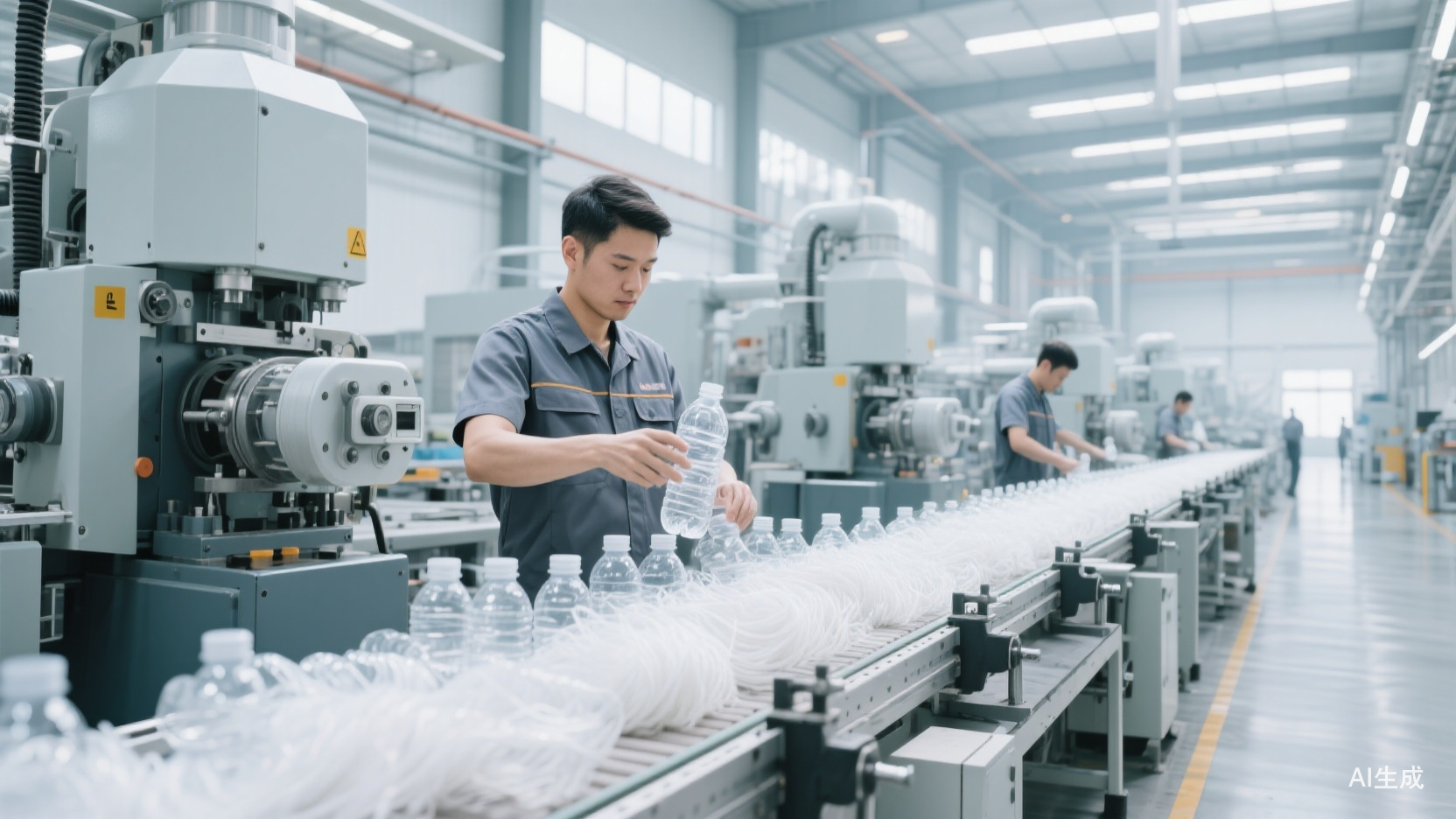 随后,瓶片在270–300℃的高温下熔融,这一温度不仅能实现PET的液化,也足以杀灭可能存在的细菌、病毒等微生物。熔融后的PET液体还会经过精密过滤,去除微量杂质,再经冷却、切粒,成为干净的再生PET切片。这些再生PET切片通过纺丝设备制成纤维的过程,与原生聚酯纤维的生产工艺完全一致。至此,废弃瓶已转变为符合纺织要求的洁净原料,后续的织造、染整工序亦与原生聚酯面料相同。