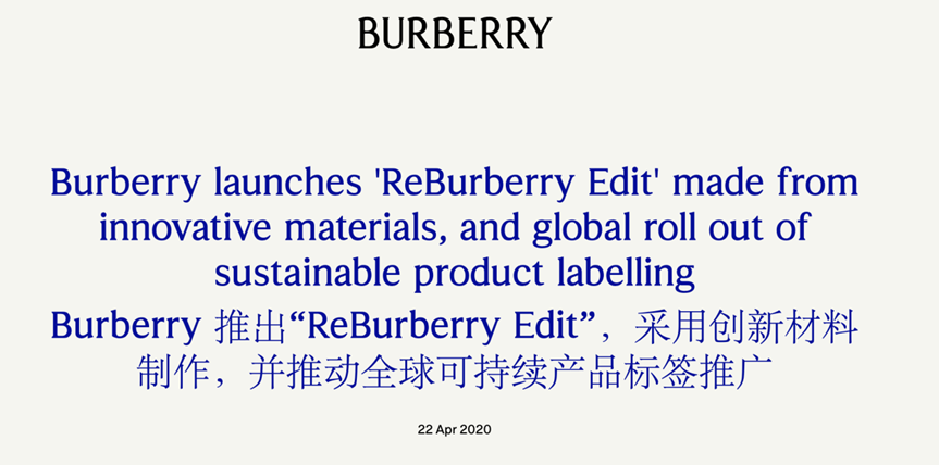 [12]Burberry launches'ReBurberry Edit'made from innovative materials,and global roll out of sustainable product labelling.https://www.burberryplc.com/news/corporate/2020/burberry-launches--reburberry-edit--made-from-innovative-materia