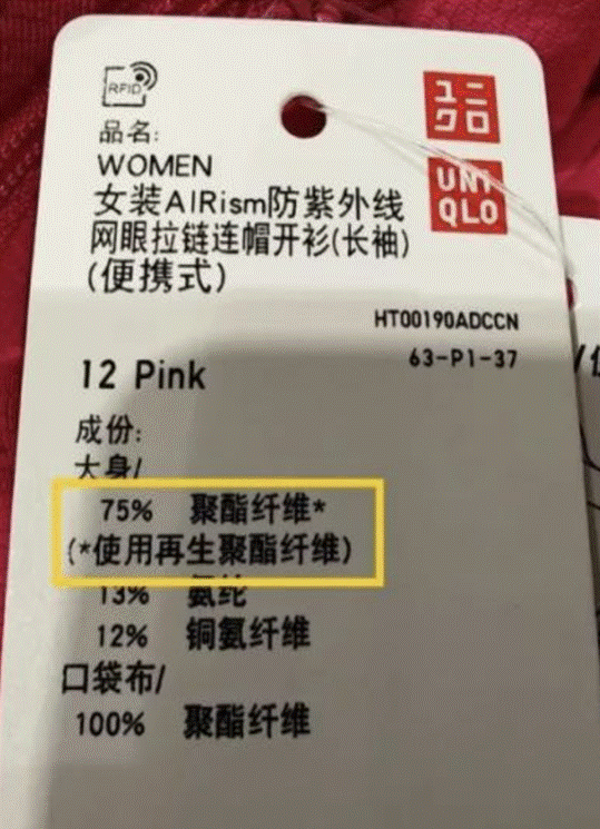 对于普通消费者而言,最直接有效的辨别方法是通过查看产品标识与认证标签。按照《纤维制品质量监督管理办法》,使用再生原料的产品必须明确标识,但是该办法将于2026年7月1日起正式施行。目前只有部分品牌会在产品的吊牌、洗水标或外包装上清晰标注“再生聚酯纤维”“rPET”“循环再生聚酯”等字样,部分注重绿色品牌建设的产品,还会额外标注再生原料的占比,以此体现产品的环保属性。