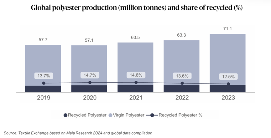 图2 TextileExchange发布的《2024年材料市场报告》中再生聚酯生产情况与数据,图表标题为全球聚酯产量(百万吨)及回收份额,浅色为原生聚酯,深色为再生聚酯[5]