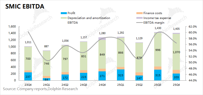 分拆指标来看,中芯国际的税息折旧及摊销前利润主要来自于经营利润的释放和折旧摊销两部分,经测算本季度的利润率(税息折旧及摊销前),回落至56.5%,主要是受本季度毛利率下滑的影响。