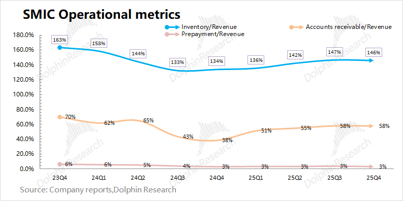 结合资产负债表中存货&应收账款和收入之间的关系,本季度存货/收入和应收账款/收入分别为146%和58%。从营运指标的角度看,中芯国际的存货占比保持平稳,整体仍处于相对合理水位。