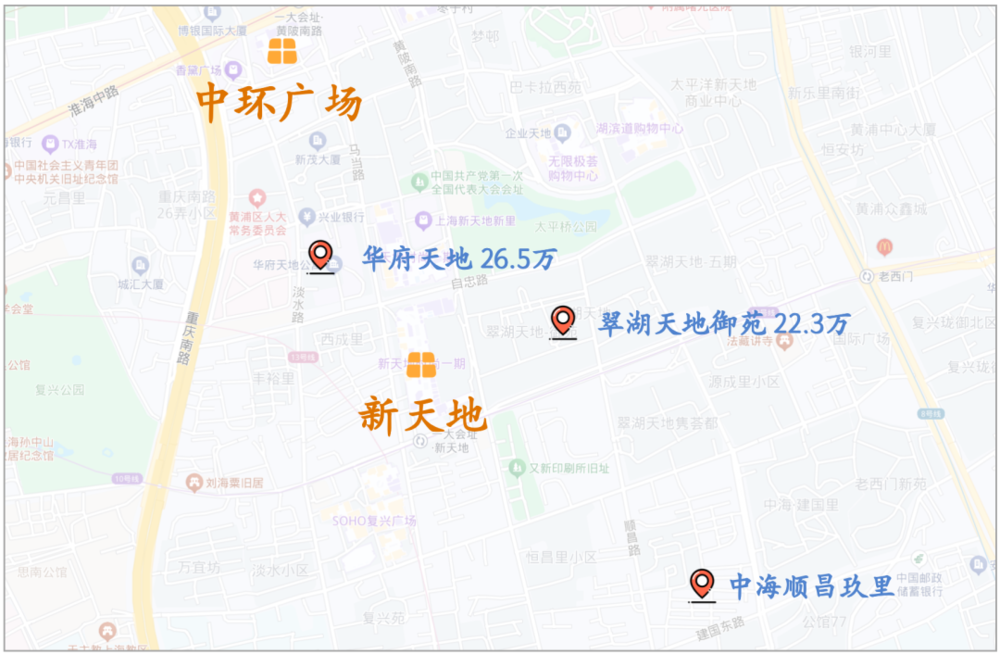 附近是二手单价20w+的华府天地和翠湖天地,新盘也有去年首开近200亿元卖爆上海楼市的中海顺昌玖里
