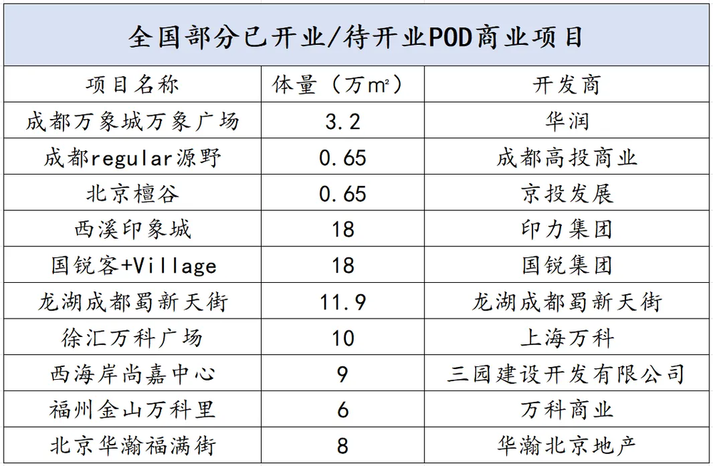 当前万科、龙湖、华润等头部商业地产企业均在相继进行POD项目的开发