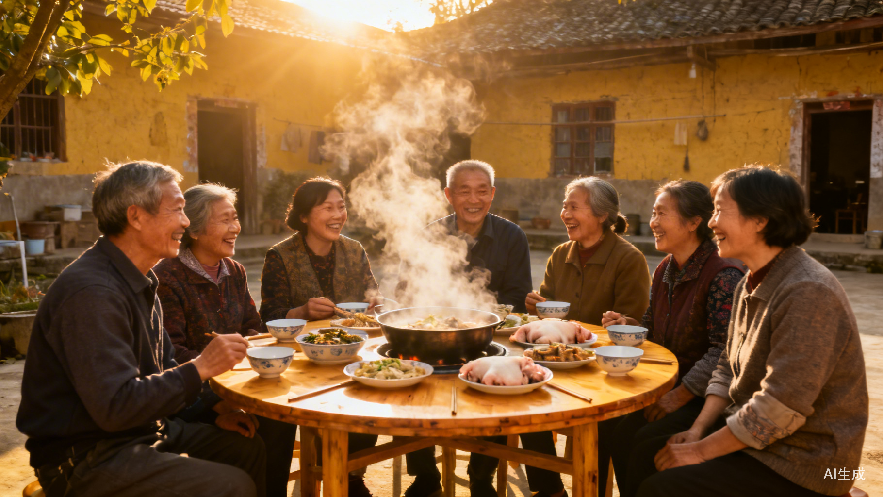 已经不分主顾了,大人们争相加入,这更像是一场年味儿游戏。越接近中午,柴火大灶里的火力似乎就越猛。压榨的菜籽油冒烟,主角带着体温投入,锅铲相撞,叮当作响。猪的灵魂还在天空盘旋,飘着山野气息的刨猪饭就摆上了院坝。