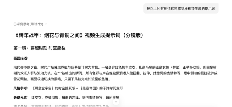 接着,我让AI把这段中二又热血的剧情转化成详细的提示词和分镜脚本。