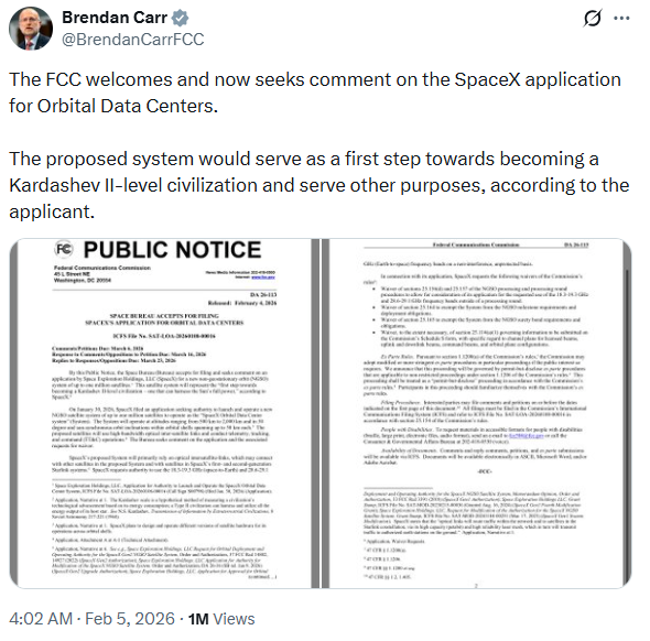几乎在同一时间,SpaceX向美国联邦通信委员会申请部署数量高达100万颗的低轨卫星网络,这一动作更像是在为某种超出现有通信需求的体系提前占位。两件事放在一起看,很难再把它们理解为彼此孤立的商业决策。