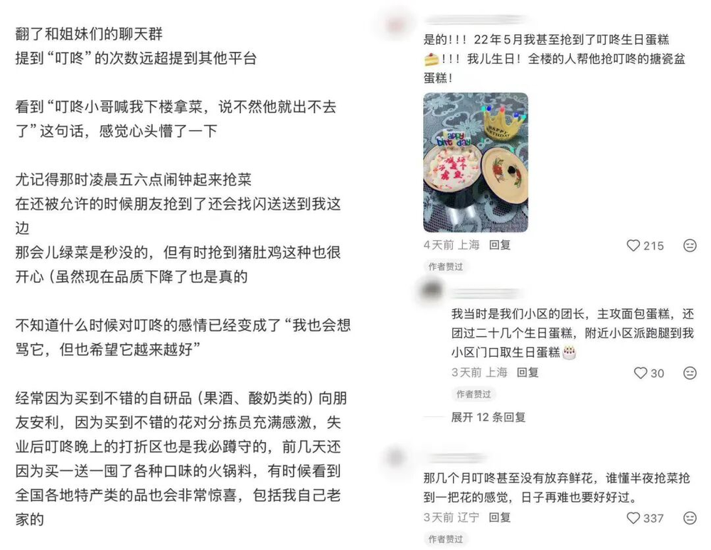 直到今天,有人依旧记得某个深夜在叮咚抢到一束鲜花,也有人仍在分享“儿子生日那天,全楼的人都在帮忙抢一份搪瓷盆蛋糕”的故事。在那个兵荒马乱的四月,鲜花和生日蛋糕都不是必需品,却提醒着所有人生活的感觉。