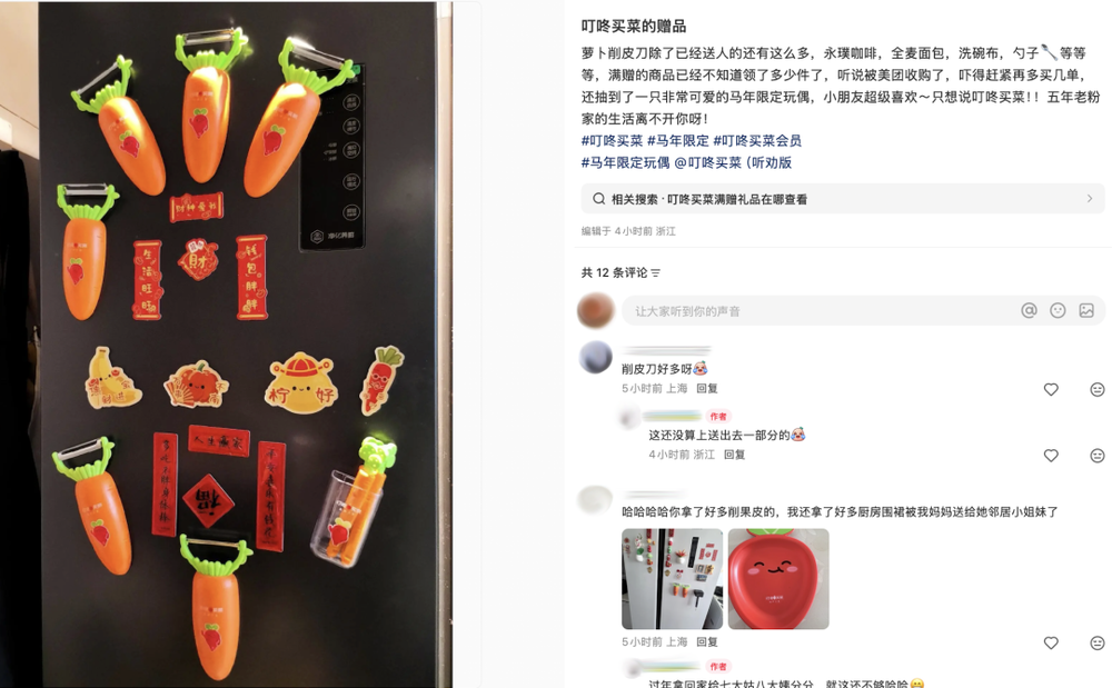 打工人细数叮咚买菜的桩桩件件,甚至连会员免费送赠的周边都不放过。“胡萝卜刮皮刀巨好用”“围裙真的很实用”等等用户反馈随处可见。