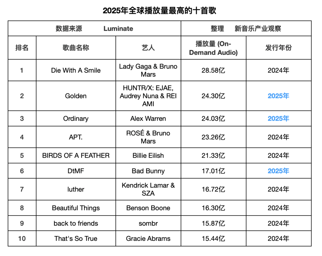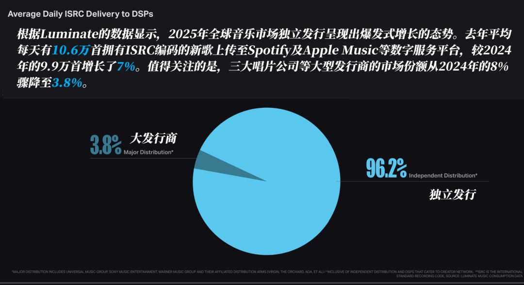 根据数据机构Luminate的年终报告,2025年,全球音乐流媒体播放量达到了5.1万亿次,比2024年增长近10%,创下历史新高。全球音乐平台上获得ISRC编码的歌曲就多达2.53亿首,比2024年新增将近7000万首。