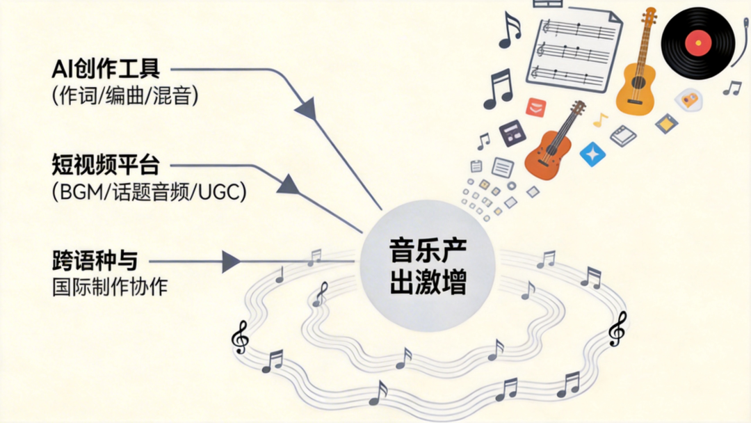 这是多重技术与商业因素共同推动的结果:AI辅助作词、编曲、混音工具越来越普及,让普通创作者也能在短时间内产出听起来专业水准的作品;社交平台对音乐内容的强化推荐策略,抖音、快手等短视频/UGC平台对原创音乐的扶持计划催生海量创作者产出音乐素材,用作视频BGM或话题音频;跨语种制作、国际制作人协作令更多音乐作品和风格进入国内创作者生态。