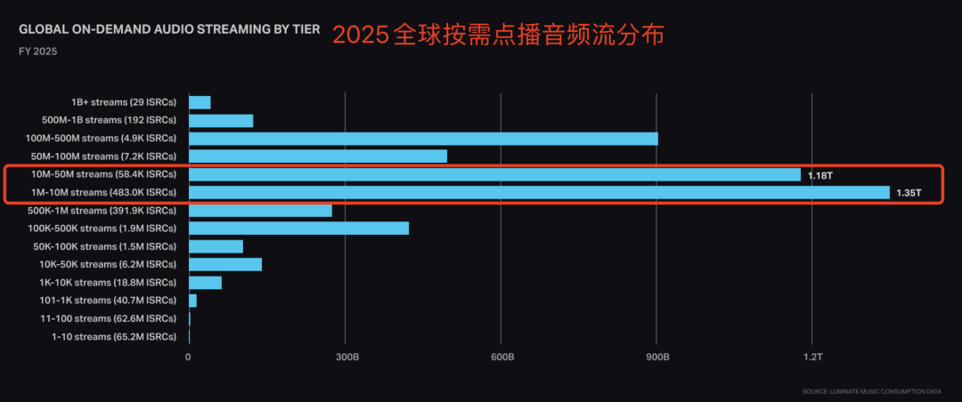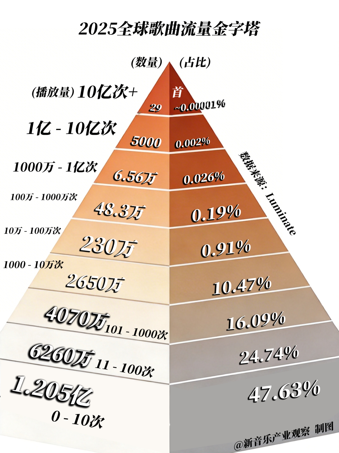 每天至少有超过10万首歌曲上传到各大音乐平台,但整个2025年,只有29首歌曲的播放量超过10亿次。Luminate估计,播放量在100万至5000万次之间的歌曲约有54.1万首歌曲,这些歌曲占据了近半数的播放量,构成了音乐消费的“主力军”,数量却仅占歌曲总量的2.14%。