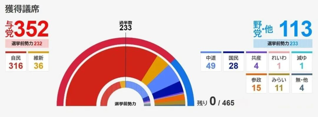 开票结果显示,日本执政联盟(自民党及维新会)以“压倒性优势”获胜,共取得465个议席中的352席,其中自民党取得316个议席,超过众议院的2/3。由此,现任首相高市早苗得以继续执政。