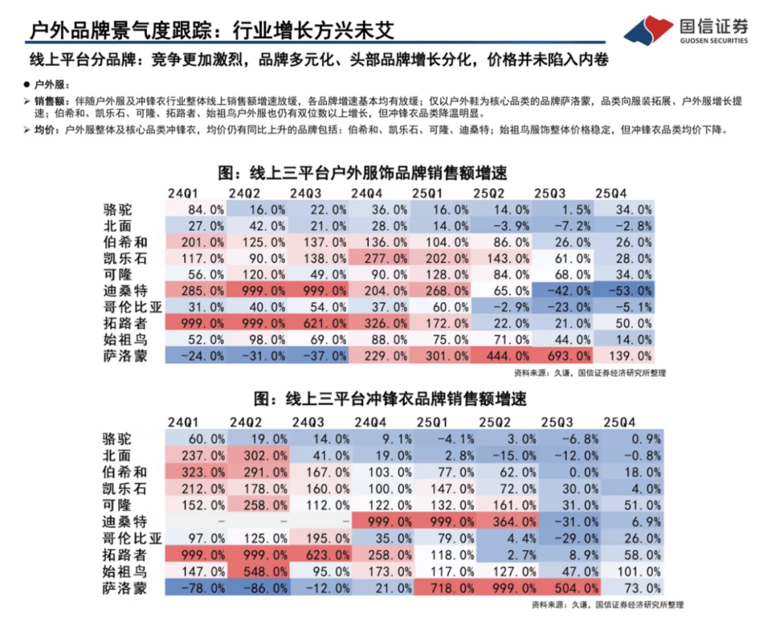 即使是前两年大火的冲锋衣,在今年也出现了降温趋势。根据国信证券的户外新消费系列研报,尽管伯希和、凯乐石、可隆等品牌仍然保持双位数增长,但冲锋衣品类增速已明显放缓,有业内人士分析这与冲锋衣在外观上款式单一、很难再做创新和差异化有关。