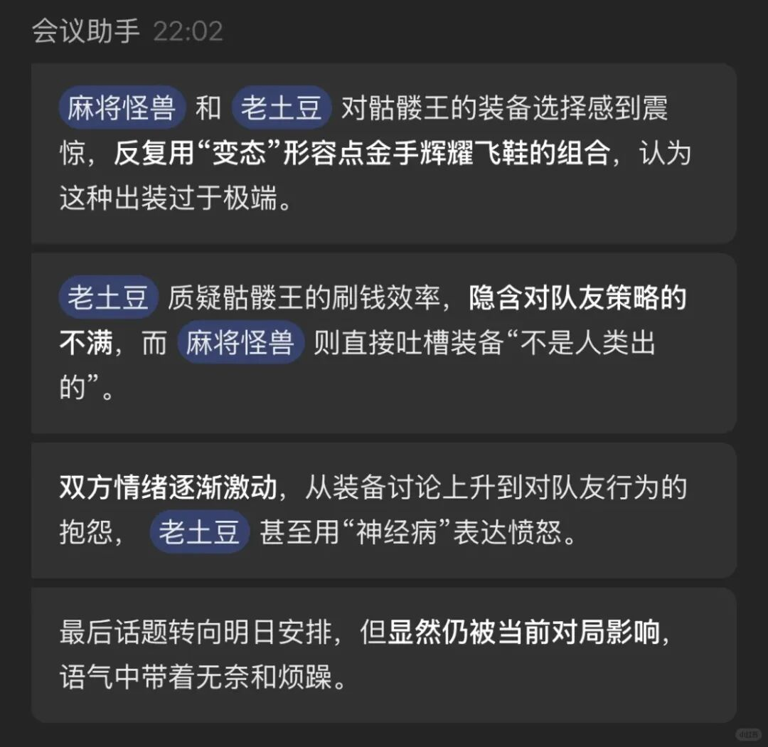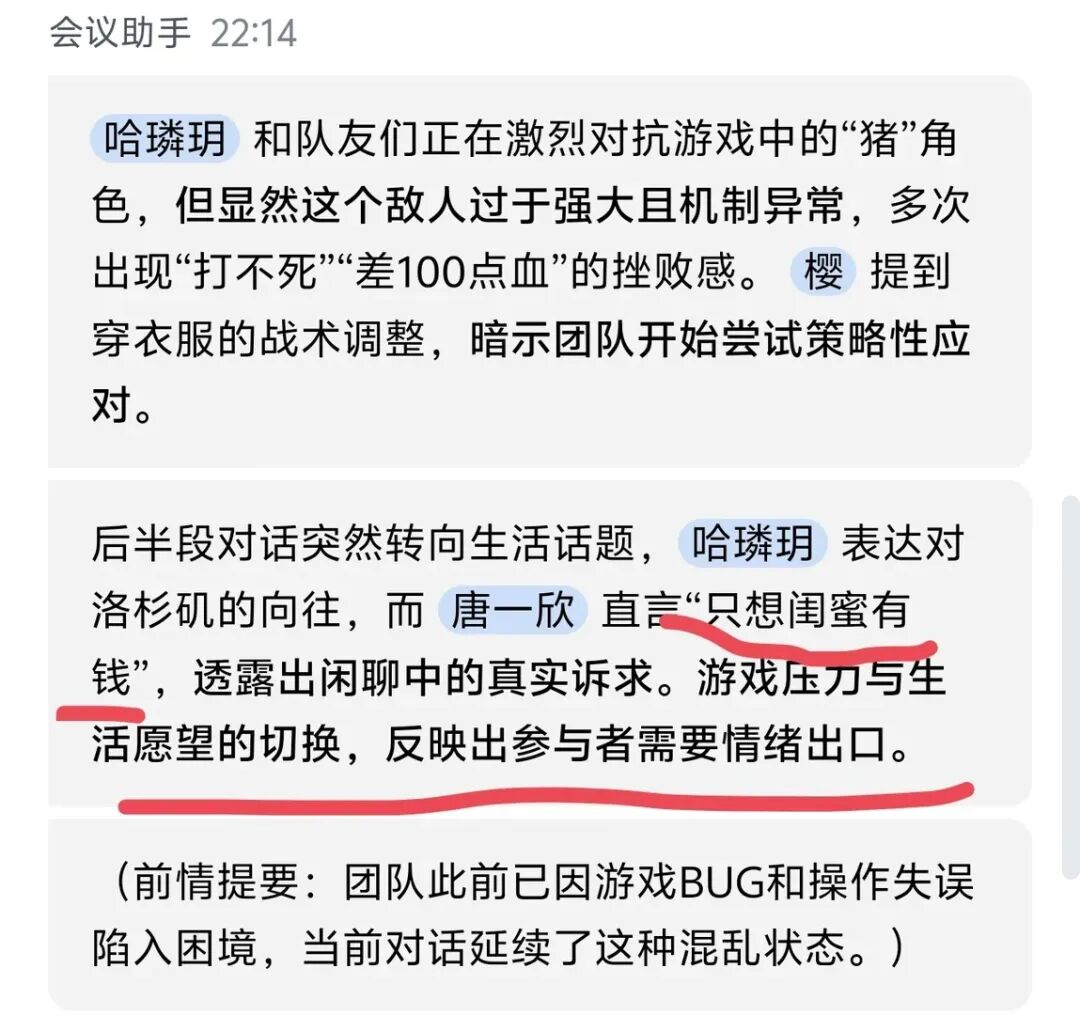 而在游戏开黑中接入“元宝纪要”,你会看到它艰难地理解开黑过程中玩家随口的胡话,梳理毫无逻辑的即兴发言,还要强崩着给个正儿八经的结论。