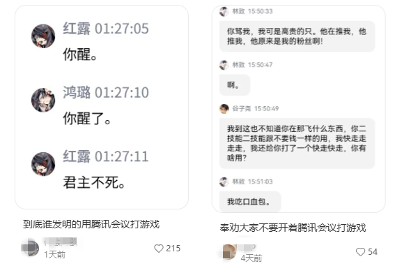 这个时候,“开会”满足的是人基本的社交陪伴需求。包括最近几年,时不时就能看到一些诸如“男朋友开腾讯会议给我打游戏”的帖子,实际上也是差不多的道理。