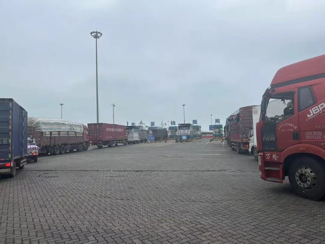 在码头排队等待出岛的货车