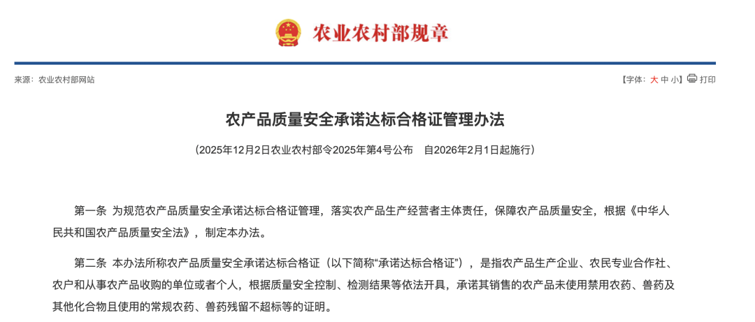 《农产品质量安全承诺达标合格证管理办法》(简称《办法》)第二条明确:本办法所称农产品质量安全承诺达标合格证(以下简称“承诺达标合格证”),是指农产品生产企业、农民专业合作社、农户和从事农产品收购的单位或者个人,根据质量安全控制、检测结果等依法开具,承诺其销售的农产品未使用禁用农药、兽药及其他化合物且使用的常规农药、兽药残留不超标等的证明。