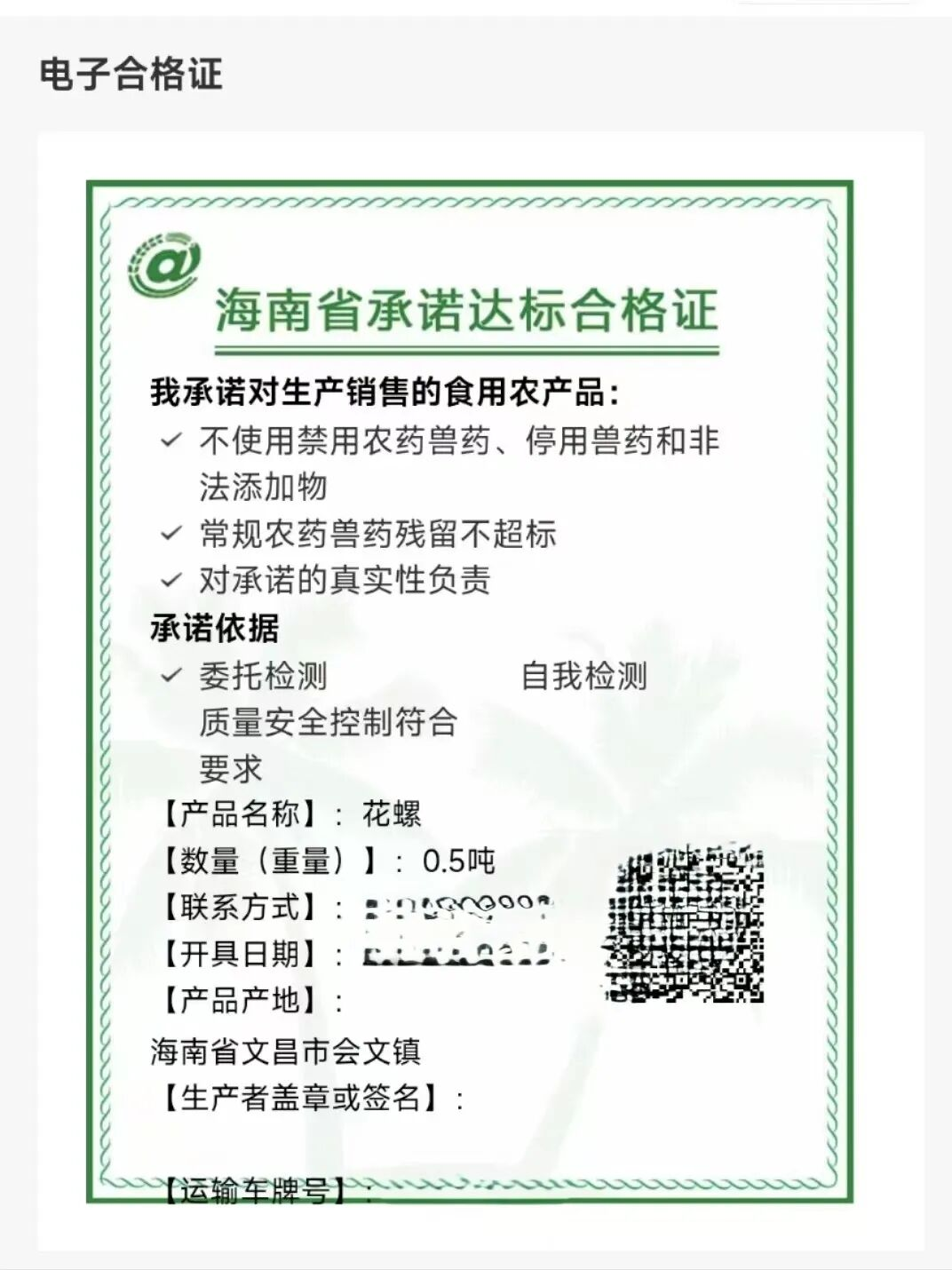(注:依据海南省关于食用农产品出岛管理的相关要求,作为建设高标准自贸港、保障“海南鲜品”品牌信誉的重要举措,所有出岛水产品均需附带承诺达标合格证或检测报告,以便实现源头可追溯、责任可倒查。)