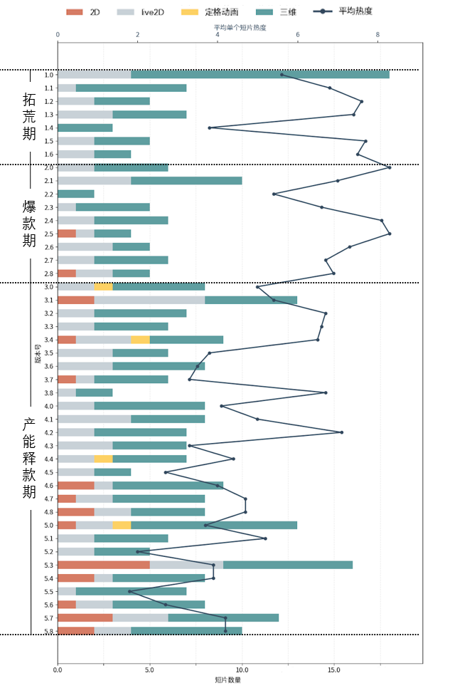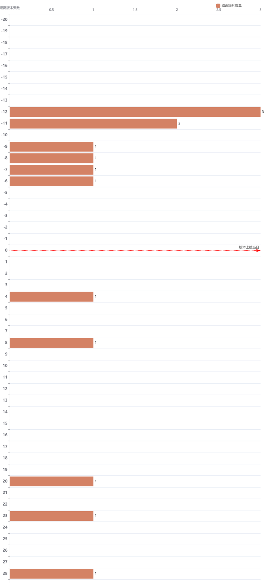 与前两个阶段(预热期、冲刺期)那种时间点固定的发布节奏不同,剧情PV与动画短片的发布并没有一个硬性的时间表,其数量分布也呈现出明显的版本差异。从统计数据来看,这类视频的产出数量与当期版本的叙事密度高度相关,而非像角色演示那样每个版本都有固定指标。