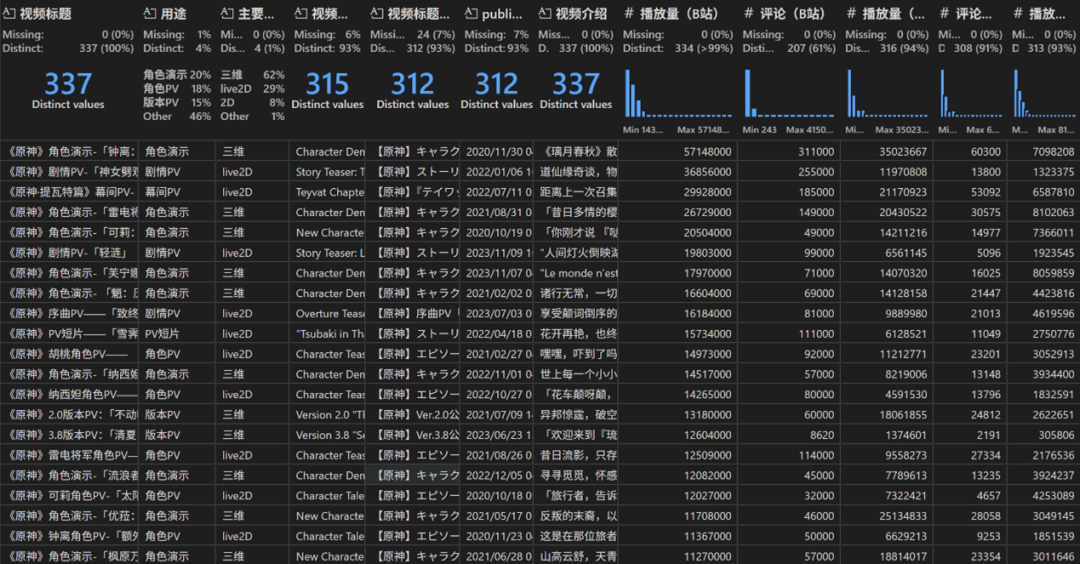 经过清洗和筛选后的337条动画短片投稿的数据记录,重点关注其发布时间、用途、制作工艺,各分发平台的热度数据