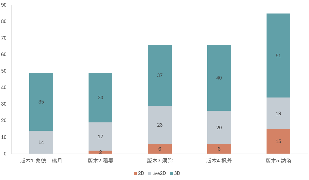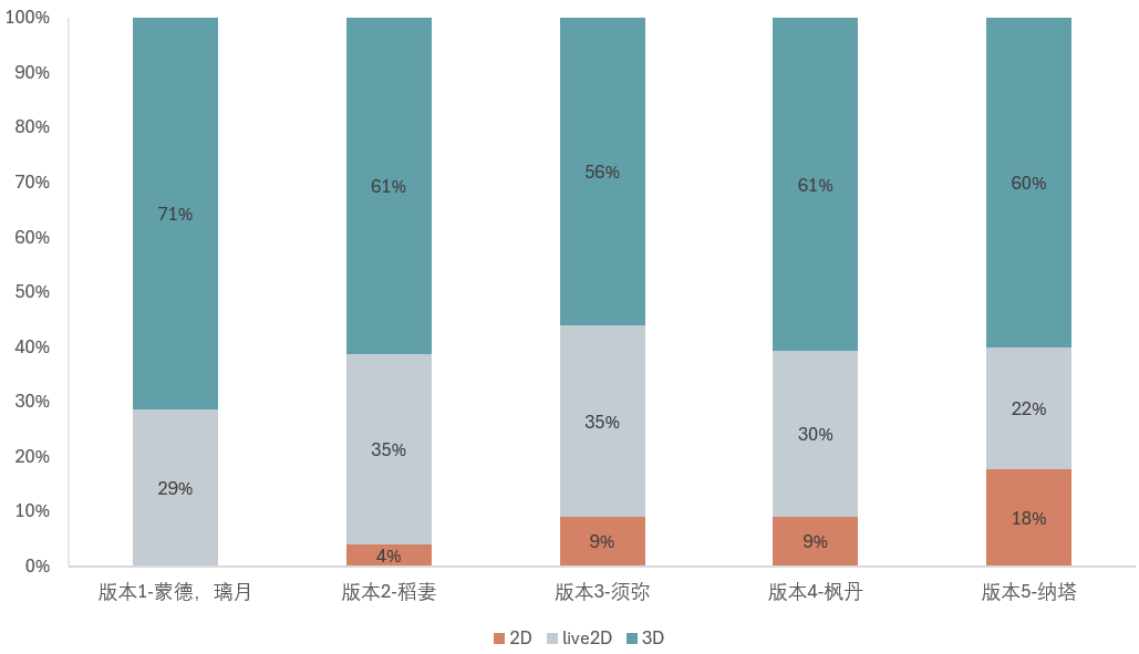 结合下图五个大版本(最新的空月之歌版本尚未更新完毕,因此未统计在内)、使用了2D手绘,Live2D,以及3D动画这三类主要制作工艺的315部动画短片数据,我们可以清晰地看到《原神》动画短片制作工艺的演进脉络: