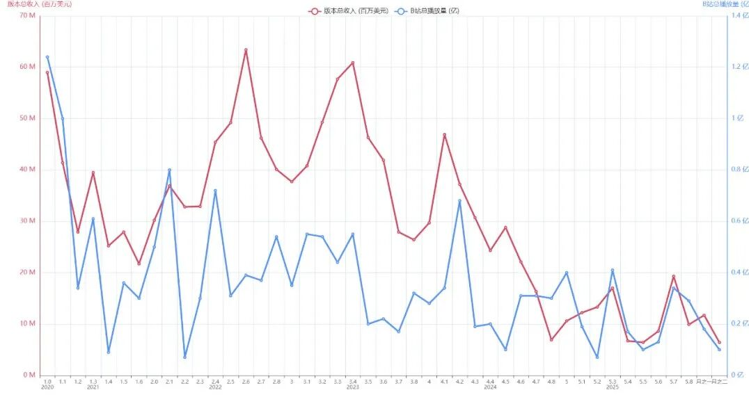 《原神》各版本累计收入与宣发短片在B站上的总播放量趋势图,24年开始下落较为明显。