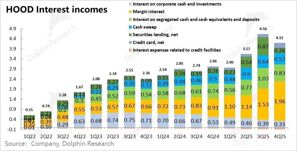 以上三项收入,再加上现金扫存(用户把闲钱通过HOOD平台购买外部银行理财)与公司自有资金利息收入,合计接近4.1亿美金,环跌10%,主要是因为融券业务大幅低于市场预期。