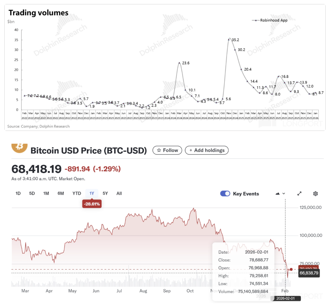 进入2026年2月,因为“量化紧缩”派候选人Kevin Warsh被提名美联储主席,市场在Warsh冲击下,高估值和流动性泛滥下如鱼得水的资产均被惨烈杀估值,Robinhood未能幸免。