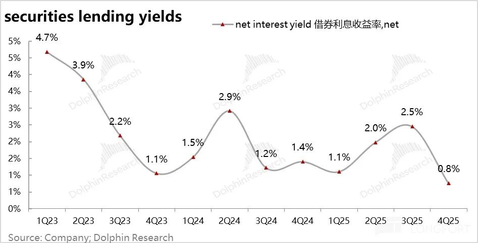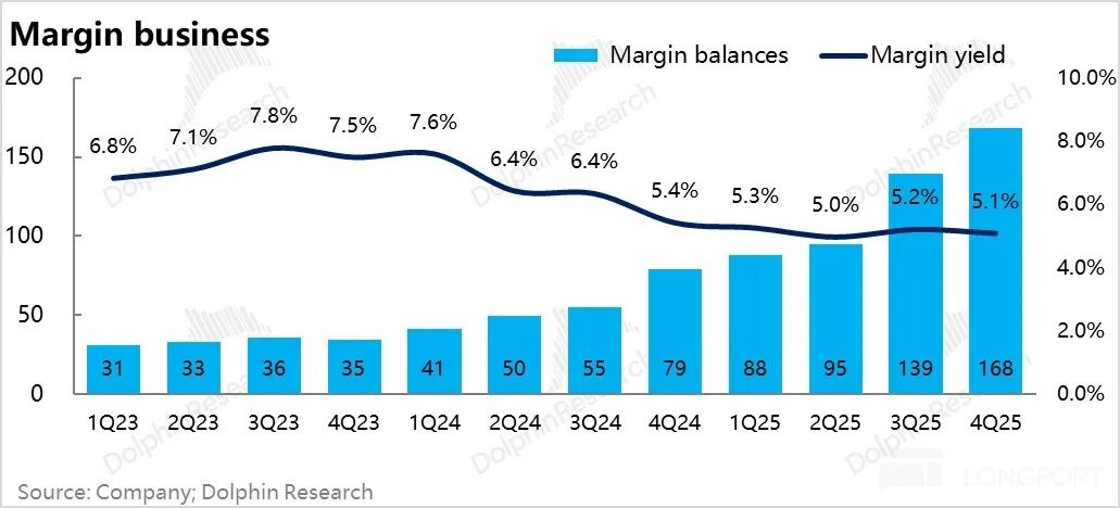 四季度的收益率甚至小幅回落到5.1%,表现相对坚挺。市场行情波动大,本季度真正高增的是融资余额从139亿直接拉到了168亿,基本保证融资业务的高增长。