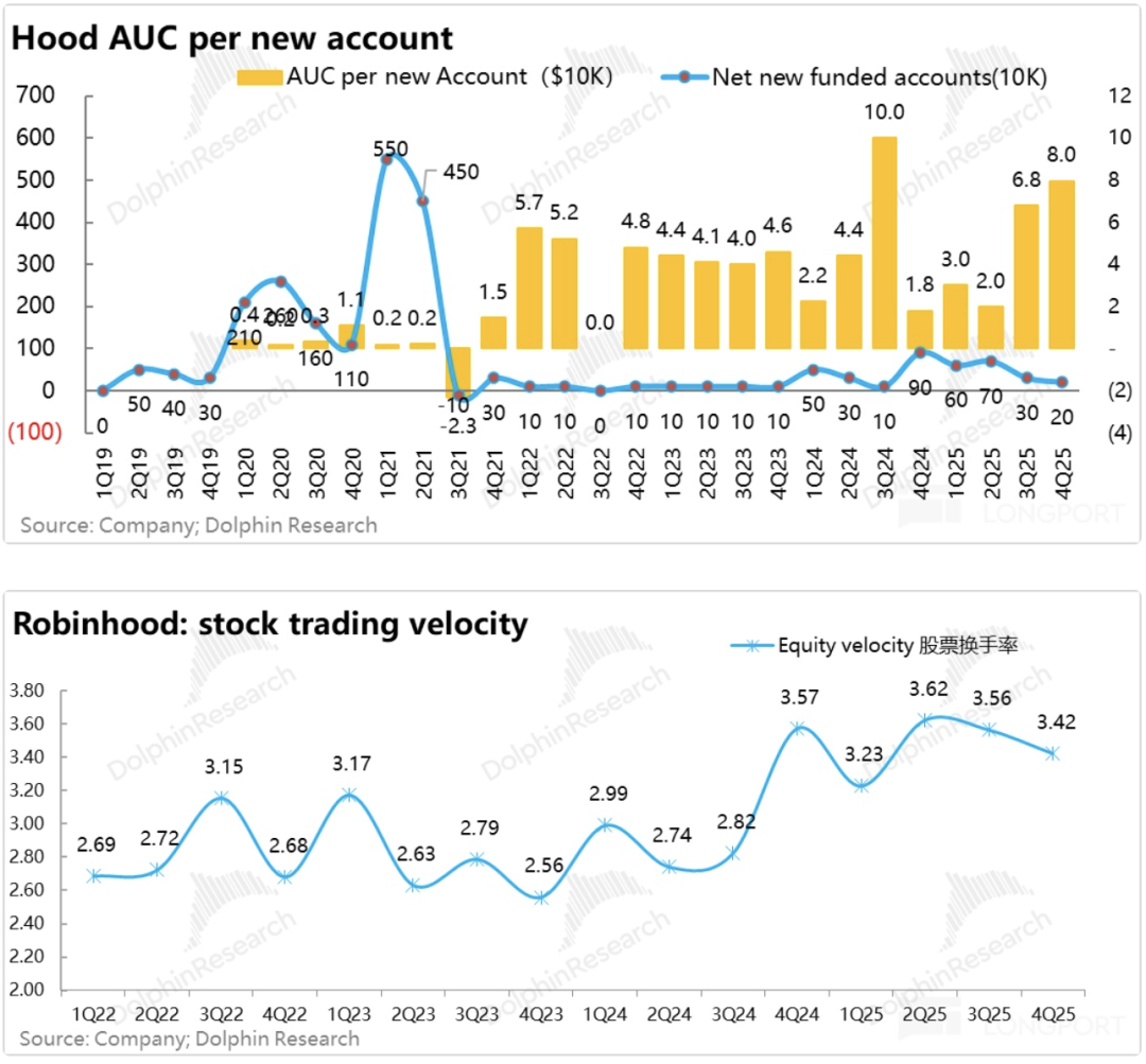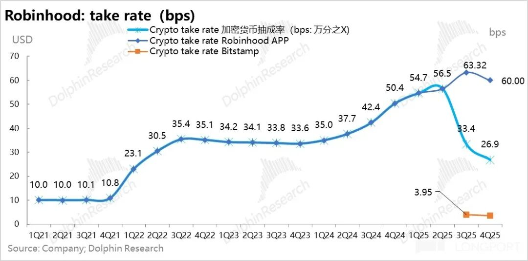 从24年下半年到2025年结束,HOOD虚拟资产变现率已经一路从35bps拉到了60bps。目前按照大行预期,Robinhood变现率拉升的高点,大约也就是70个基点上下,虚拟货币的变现拉升期事实上应该已接近尾声。