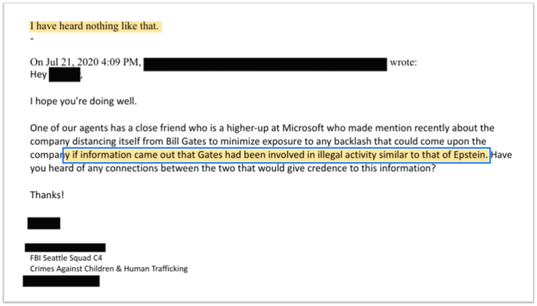 没有任何证据显示盖茨参与了爱泼斯坦的犯罪活动,2020年,FBI内部还讨论过: