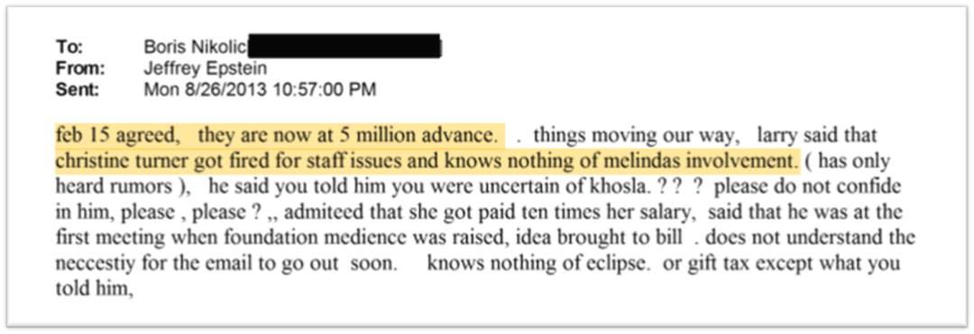 Boris的离职,依据当事人的邮件往来,确实可能是梅琳达主导。我们甚至不难想象,发现丈夫行为不端后,盖茨当时的左右手Boris,以及长期的行政助理Chrisitine Turner,都被梅琳达认为严重失职,必须走人。