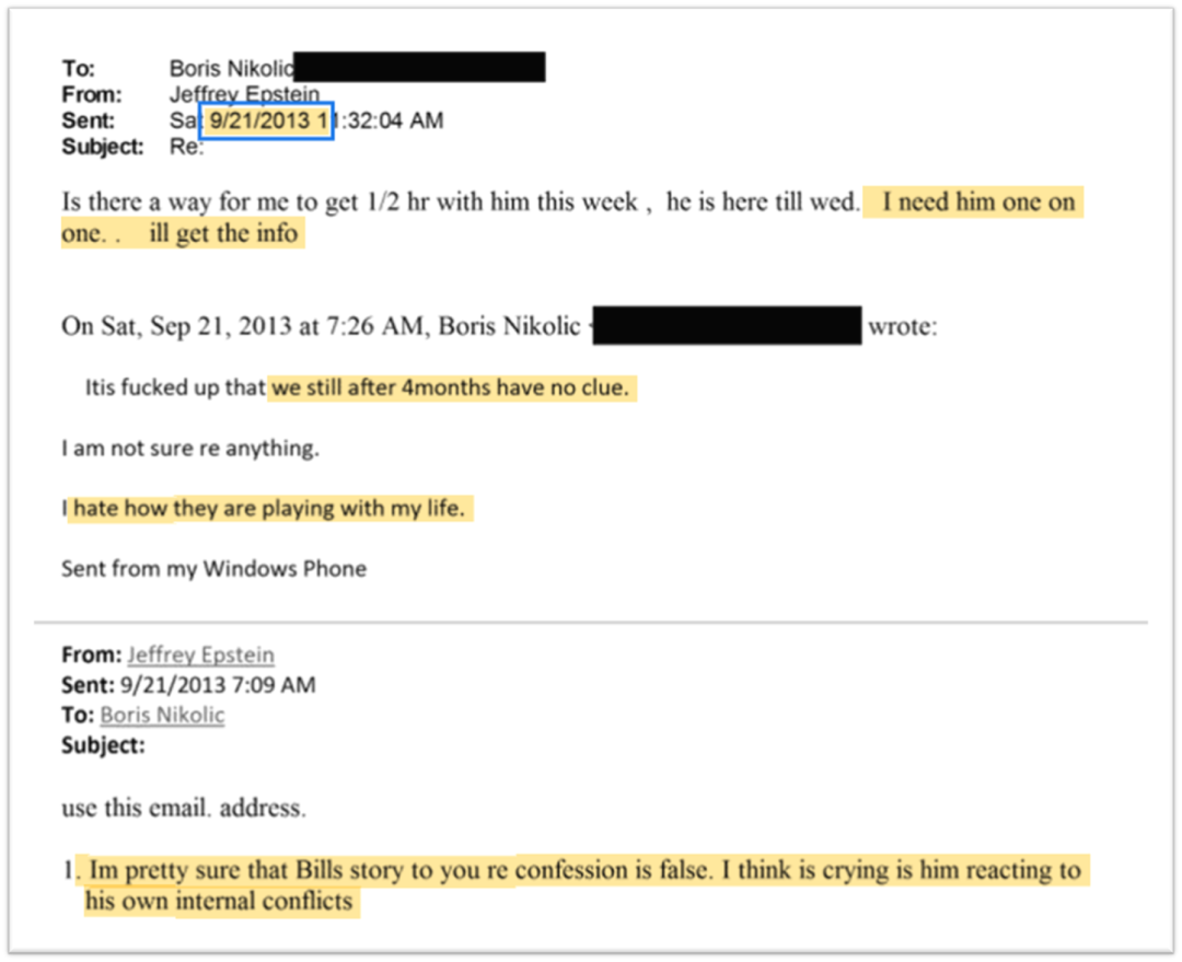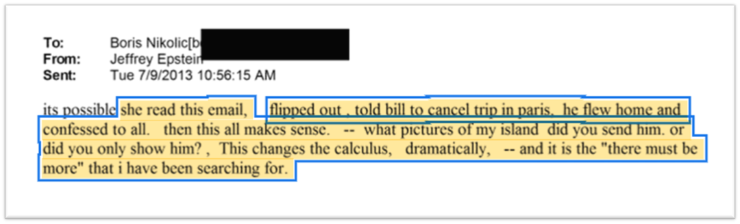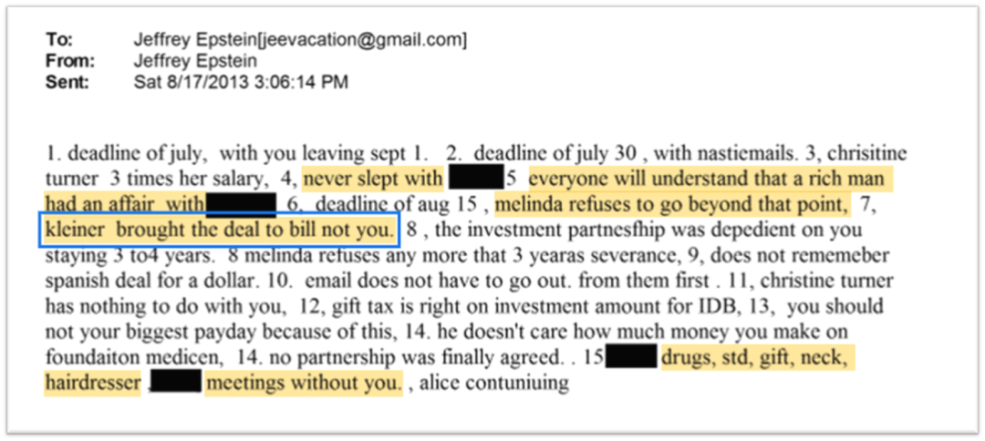 这些对我们之后挖掘相关内容非常重要。不到一小时,2013年7月13日12:39,爱泼斯坦给自己发了第二封以比尔(盖茨)为邮件名的电邮: