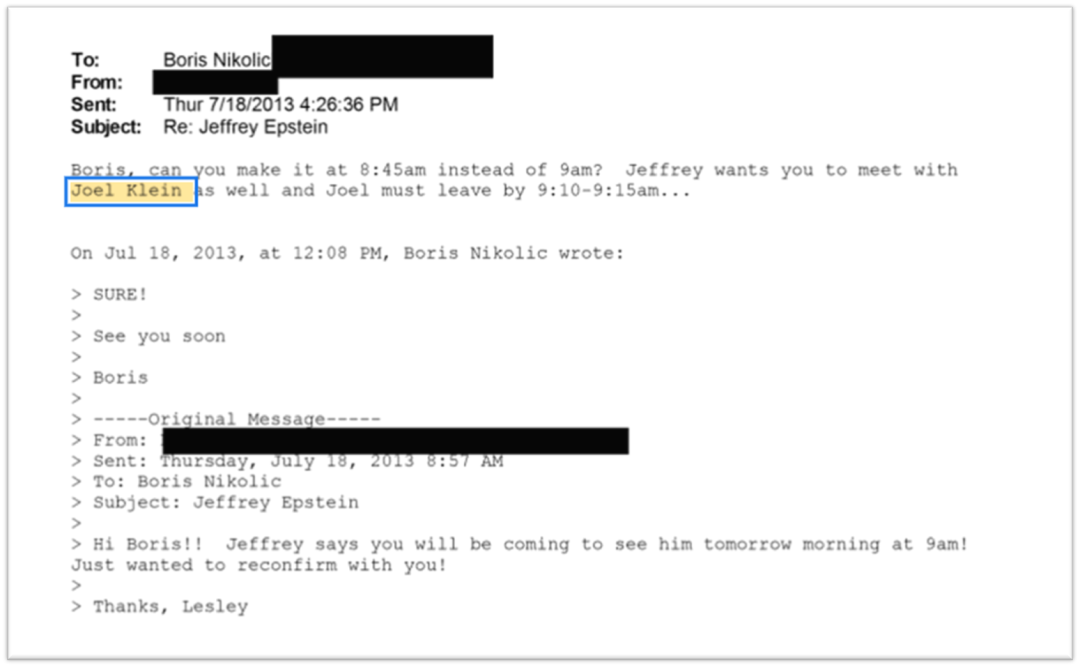 Boris 7月1号接到解职的邮件,计划19号和爱泼斯坦见面,可见对后者的依仗。而爱泼斯坦18号特别告知Boris,能不能早到15分钟,介绍一位Joel Klein见面。