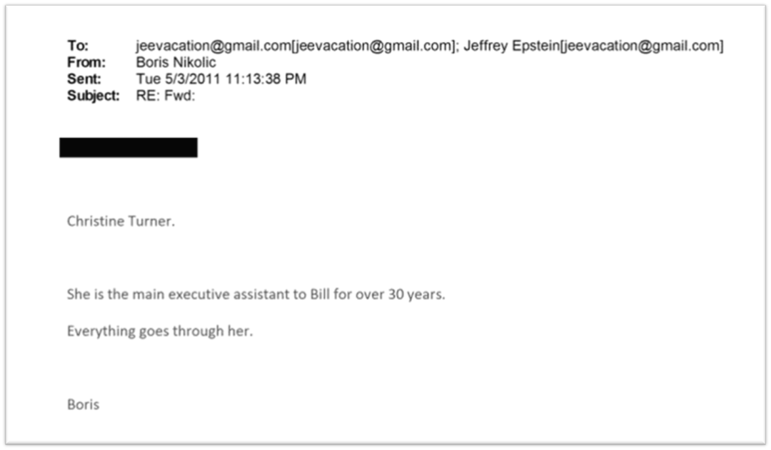 如,2011年5月,爱泼斯坦问Boris怎么联系盖茨,后者告知要找Christine Turner,她是盖茨超过30年的行政助理,什么事都经过她。