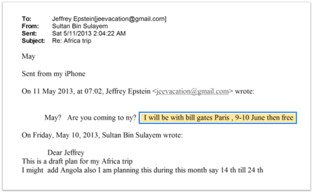 2013年6月9-10号,爱泼斯坦陪同盖茨、Boris访问巴黎。该行程在爱泼斯坦与Sultan Ahmed Bin Sulayem的邮件往来里就有提及: