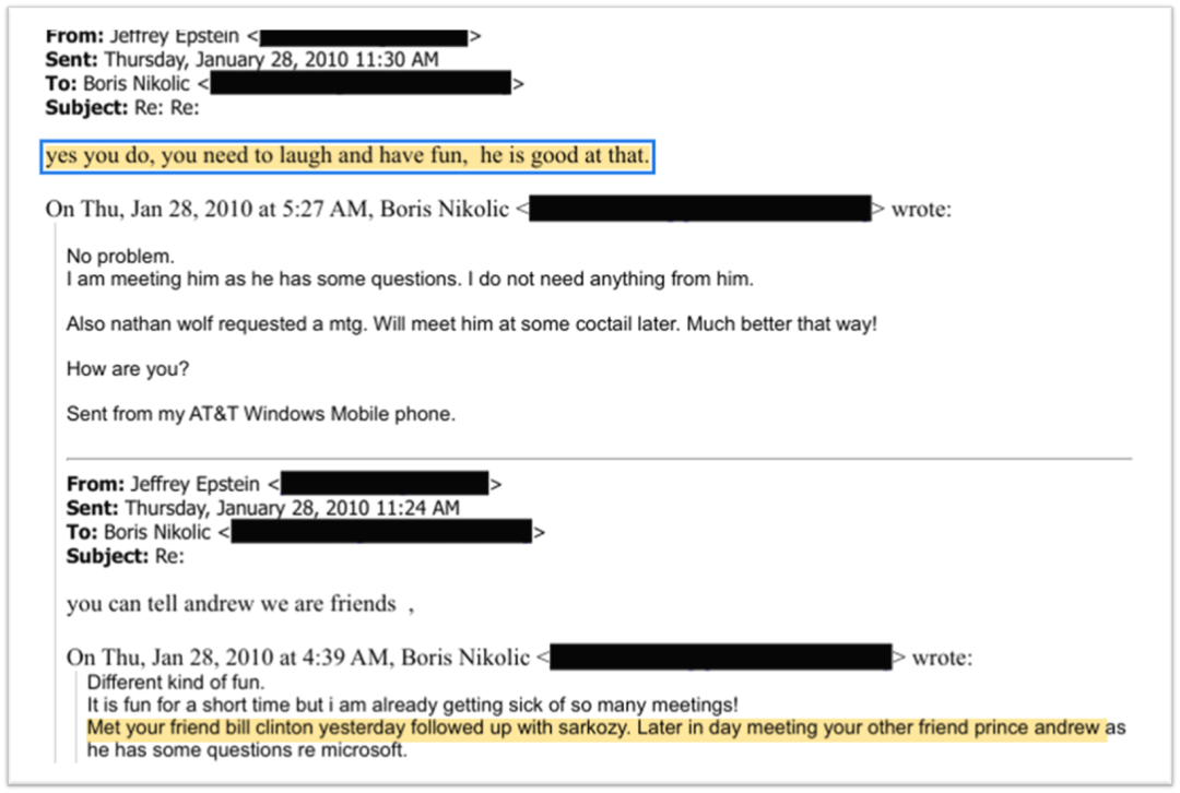 2010年1月28日,Boris告诉爱泼斯坦自己在一个会议上碰到了他的朋友克林顿、萨科齐(法国前总统)以及安德鲁王子,安德鲁有些关于微软的问题要问他。