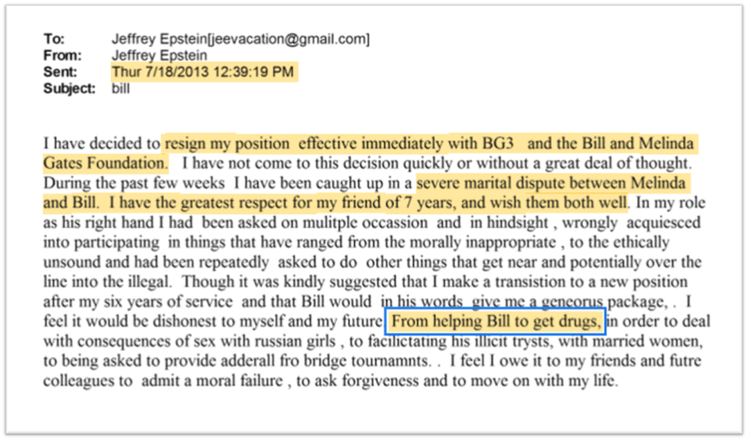 前一封是明确写给盖茨,收信人就是比尔,全篇则是向盖茨申诉自己的忠诚没有得到应有的回报。第二封没有指明写给谁,却以“我即刻从盖茨基金会辞职”开头,后面描述是“我卷入了比尔与梅琳达的婚姻矛盾”,“我帮比尔做了XX”。这封邮件更像是发给盖茨基金会的其他人。