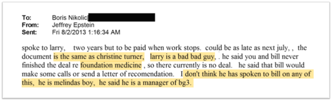 提到给Boris两年赔偿,和Christine Turner一样——佐证此前爱泼斯坦写的这人同时被解职。有趣的是这里提到Larry不是好人,是梅琳达一派,很多事情可能没和盖茨说。