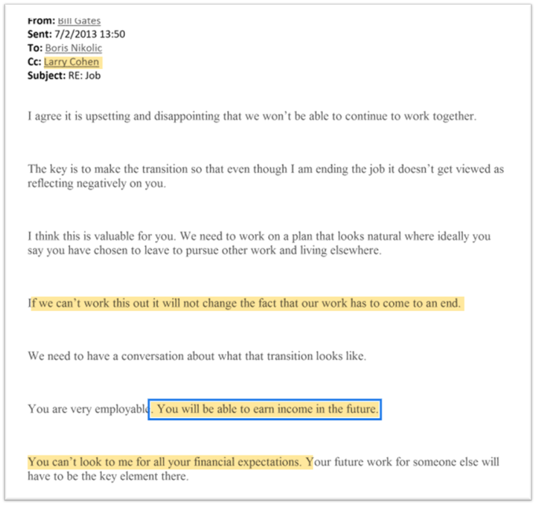 内容似乎是Boris与盖茨一方就离职谈判的交锋反复。我们没法确定这是真实发生了,爱泼斯坦做的记录,还是爱泼斯坦假设谈判可能会如此来回。