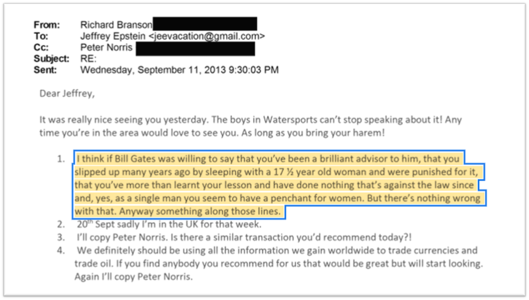 爱泼斯坦为什么与盖茨保持联系,从一些邮件往来能看出,爱泼斯坦带来了人脉、关系。当然,盖茨也成了爱泼斯坦的人脉资源。例如2013年9月,维珍集团创始人,英国富豪Branson给爱泼斯坦的邮件里提到如果盖茨能为爱泼斯坦人品作证,公关上很有用: